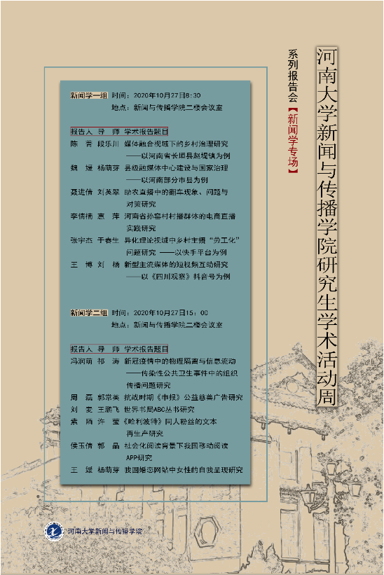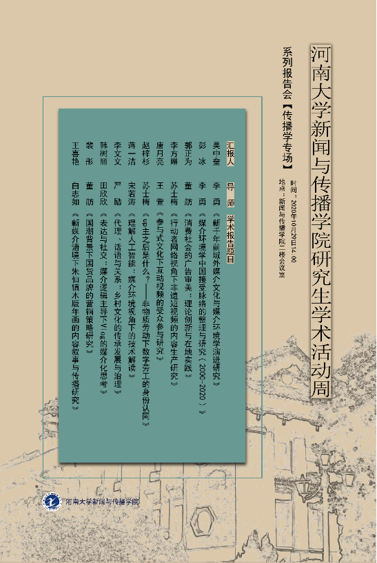 为进一步促进必赢国际官网研究生的学术创新能力,营造积极向上的学术氛围,学院拟结合中期考核开展研究生学术活动周,组织2018级新闻传播学、戏剧与影视学专业研究生做专场主题学术报告。