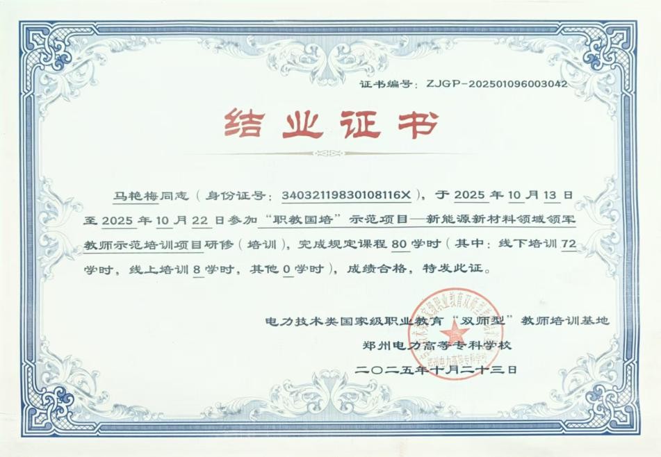 为加快“双师型”教师队伍建设,10月12日,今年会选派今年会马艳梅老师赴郑州电力高等专科学校,参加教育部2025年“职教国培”示范项目——新能源新材料领域领军教师示范培训。
