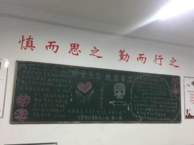 我系各班开展了以“珍爱生命,远离毒品”为主题的主题班会活动。首先,各班班委通过相关事列为同学们讲述了毒品的各种危害,然后组织各班进行了毒品的知识普及大会。并通过播放禁毒电影,使同学们更加深刻地感受到毒品对人类的危害。最后,组织各班进行了以“珍爱生命,远离毒品”为主题的黑板报。从板报考核中可以看出,同学们通过本次活动深刻的认识到了毒品的危害性,学会了如何拒绝毒品的诱惑,在一定程度上提高了他们的自我防护意识。