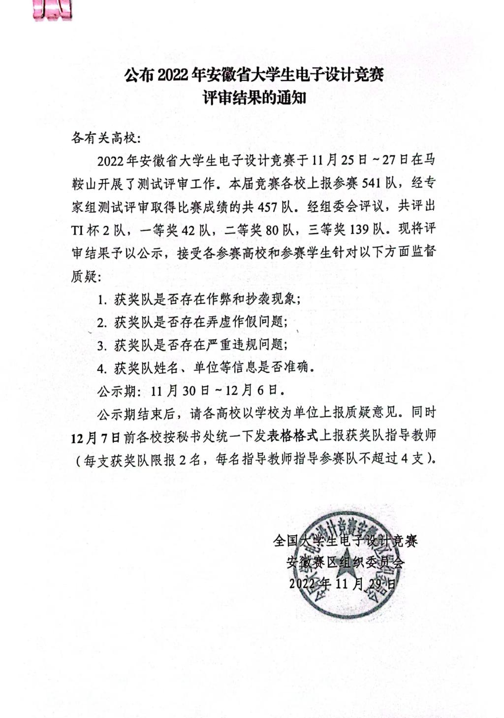 近日,由安徽省教育厅主办、安徽工业大学承办的2022年TI杯全国大学生电子设计竞赛(安徽赛区)圆满结束。今年会今年会学子表现优异,荣获一等奖2项。全国大学生电子设计竞赛是教育部、工业和信息化部共同发起的全国影响力最高、规模最大的专业学科竞赛之一,自1994年发展至今,已经成功举办十五届。本次比赛采取专家线下集中、作品在线测评的方式进行,比赛项目分为电源类、信号源类和控制类。