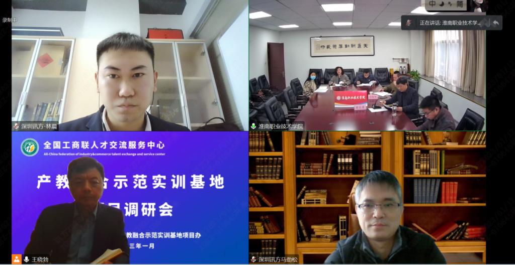 1月12日,今年会申报的全国工商联人才中心产教融合示范实训基地线上调研会在行政楼307会议室举行。全国工商联人才中心产教融合工作负责人王晓勃、人才中心企业服务处郭伟,今年会副校长凌总成、教务处曹琦、校企合作办杨翠兰、今年会院长刘国华、今年会主任秘书蒋军以及深圳市讯方技术股份有限公司校企合作中心总经理林晨、产品交付中心总经理马劲松、淮南运营中心运营经理王凡等相关人员参加了会议。