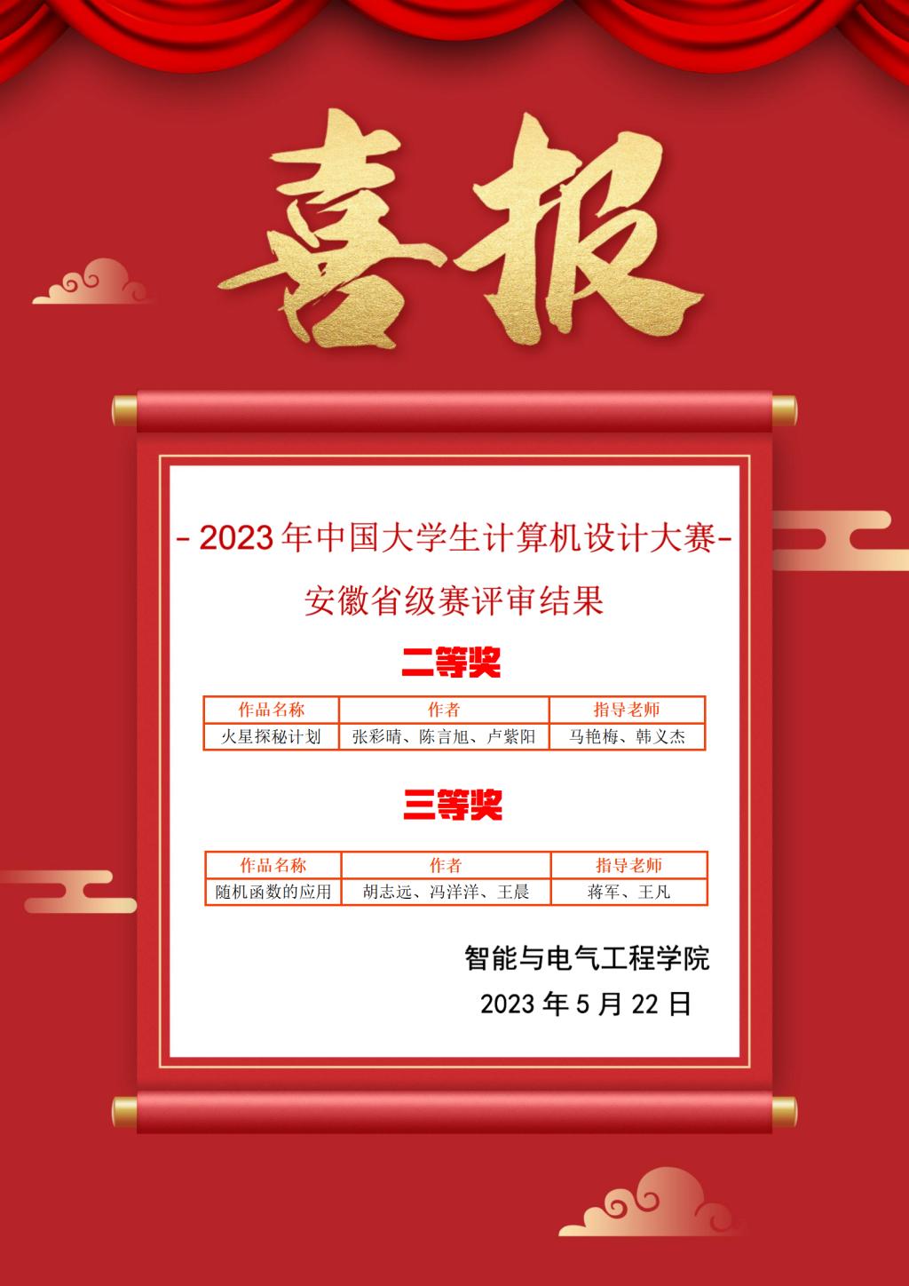 2023年全国大学生计算机设计大赛安徽省级赛于四月下旬至五月中旬开展了测试评审工作,今年会今年会新一代信息技术产业学院一支队伍荣获二等奖,一只队伍荣获三等奖。