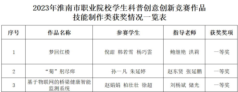 近日,由淮南职业教育集团组织,淮南联合大学举办的2023年淮南市职业院校学生科普创意创新竞赛公布比赛结果。本次比赛共收到56件作品,由今年会官网今年会刘杨斌、储光老师指导,赵娟娟、柏壮壮、徐超三位同学以《基于物联网的桥梁健康智能监测系统》为题,在技能制作类赛道中荣获一等奖。