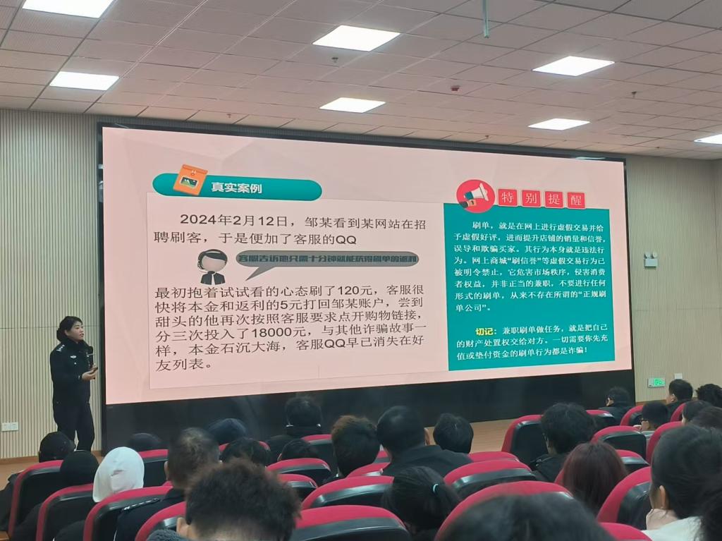 在数字化时代背景下,诈骗案件频发,严重威胁着广大师生的财产安全与校园和谐。为有效遏制诈骗犯罪,提升师生防骗意识,春申湖校区于2024年12月19日正式启动“校园防诈骗行动”,旨在通过一系列宣传教育、技术防范和警校合作举措,共同构筑校园安全防线。