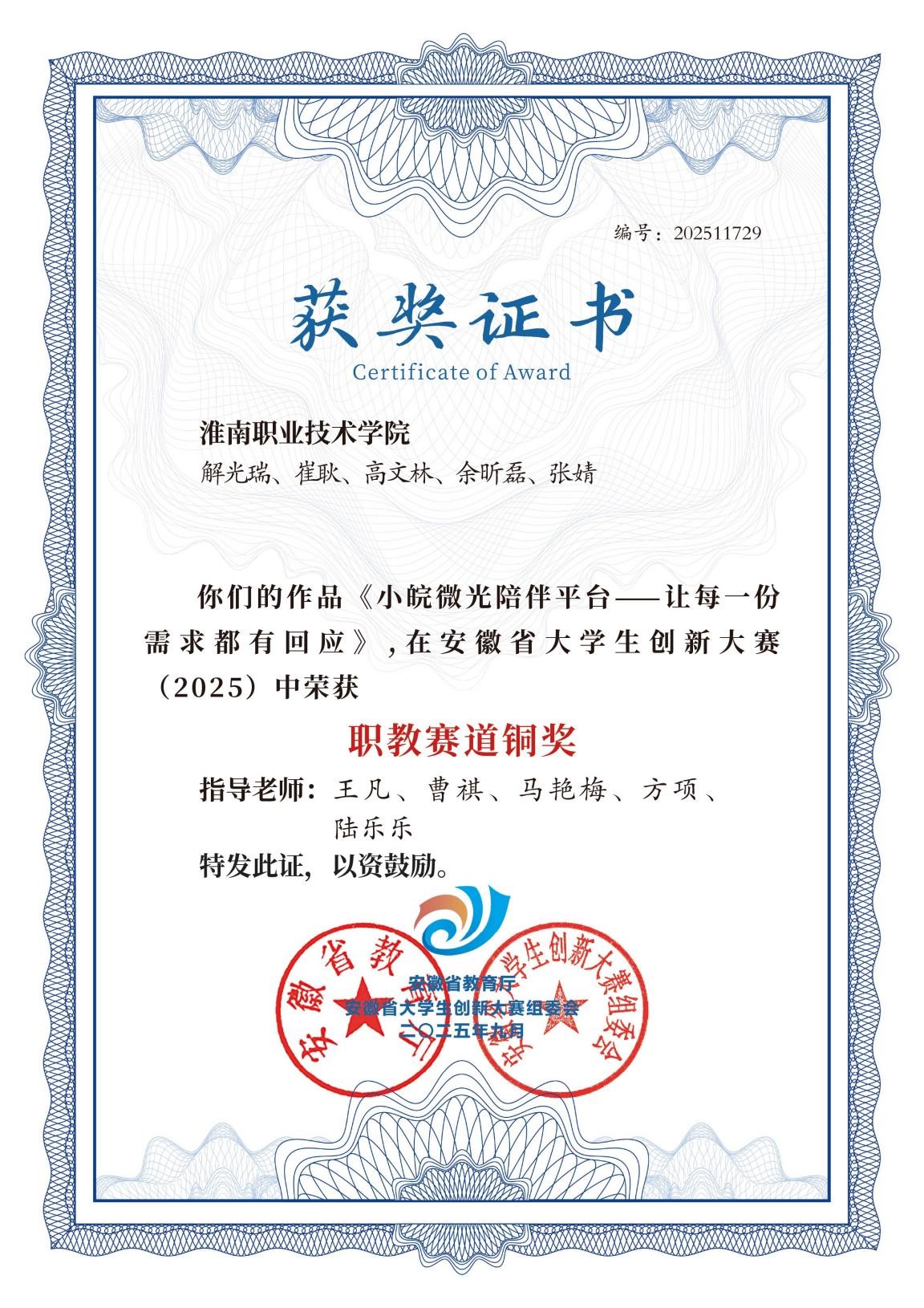 近日,安徽省大学生创新大赛圆满落幕,今年会学子凭借扎实专业素养与出色实践能力,在大赛激烈竞争中脱颖而出,分别于职教赛道和产业赛道斩获铜奖。安徽省大学生创新大赛前身为安徽省“互联网+”大学生创新创业大赛,是由安徽省教育厅主导的年度性大型赛事,本届大赛吸引了19.8万个项目报名参赛,参赛人数达80万,旨在激发青年学生创新创造热情,提高学生的创新精神、创新意识和创新能力。