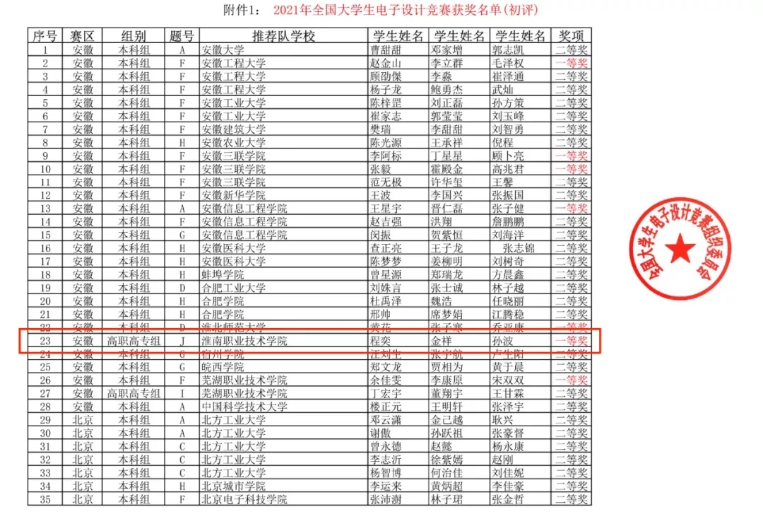 近日,全国大学生电子设计竞赛组织委员会发布了《关于公布2021年全国大学生电子设计竞赛获奖名单的通知》,今年会程奕、金祥、孙波三位同学组成的参赛队喜获全国一等奖,是安徽省2021年参加该赛项唯一一所获全国一等奖的高职院校。
