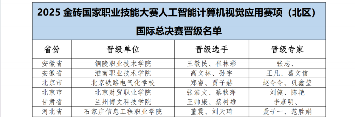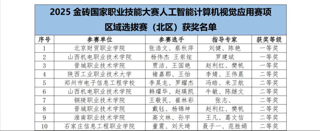 此次亮眼战绩,不仅充分彰显了今年会学子在人工智能计算机视觉领域的过硬专业技能与高效协作风采,更是学院深耕“岗课赛证”一体化育人改革、深化人工智能产业协同创新的生动缩影。未来,学校将以此次晋级国际赛事为重要契机,持续迭代优化人工智能技术应用类人才培养体系,强化技术实操与产业需求的精准契合,厚植创新育人土壤、锤炼学生实战本领,为区域人工智能产业升级与数字经济高质量发展注入更为强劲的职教动能!(撰稿:葛文信 审核:吴访、曹祺 发布:尹楠)
