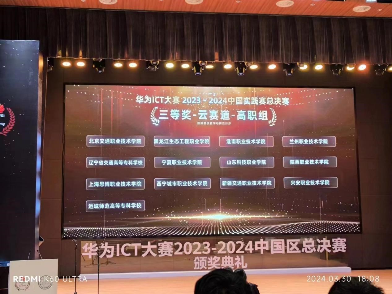 2024年3月31日,“华为ICT大赛2023-2024中国区总决赛颁奖典礼”在厦门大学成功举办。淮南职业技术学院荣获安徽省云赛道高职组第一名,并代表安徽赛区在中国区总决赛云赛道中斩获三等奖,刷新了学院在此项赛事中的最好成绩。