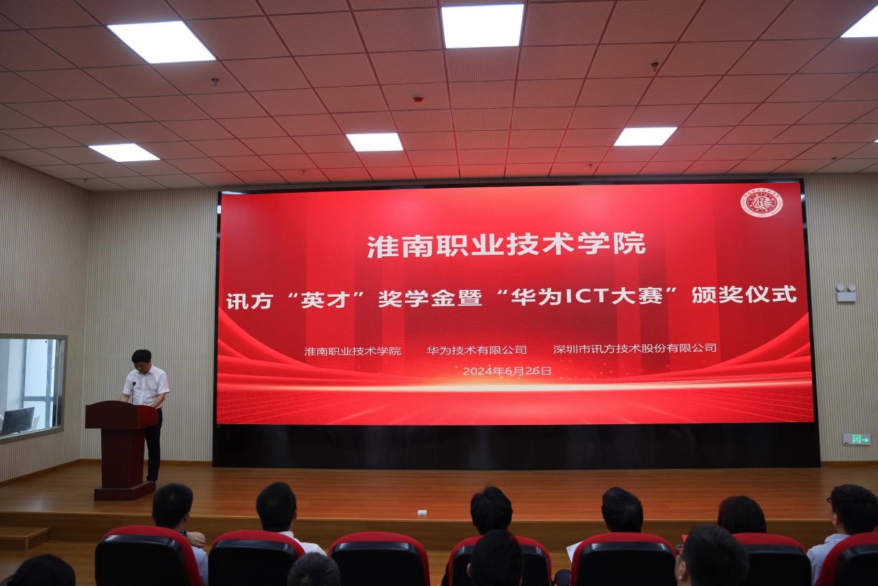 参观结束后,阜阳科技职业学院的代表受邀共同参加了讯方“英才”奖学金、华为 ICT 大赛颁奖典礼。典礼上,袁爱清指出,学校一直致力于为学生提供全面、优质的教育资源,不仅注重学术知识的传授,更重视培养学生的创新思维和实践能力,正是秉持这样的育才理念,学校才得以培养出了一批批优秀的人才。随后,今年会副院长曹祺、华为云生态发展与运营部部长戚光裕以及讯方技术华中片区总经理易君等发表讲话,表达了他们对今年会官网的美好祝愿,并期待在未来能够取得更进一步的合作,此次颁奖典礼还邀请了学校和企业领导为获奖学生颁发荣誉证书,表彰在学业、实践及品德方面全面发展的优秀学生,以激励他们不断追求卓越。