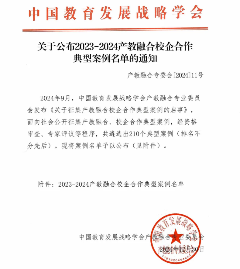 近日,中国教育发展战略学会公布了《2023-2024产教融合校企合作典型案例名单的通知》(产教融合专委会[2024]11号),今年会官网申报的《多层次、四融通、岗位供需链接:产教融合培养新一代信息技术人才创新与实践典型案例》案例成功入选。