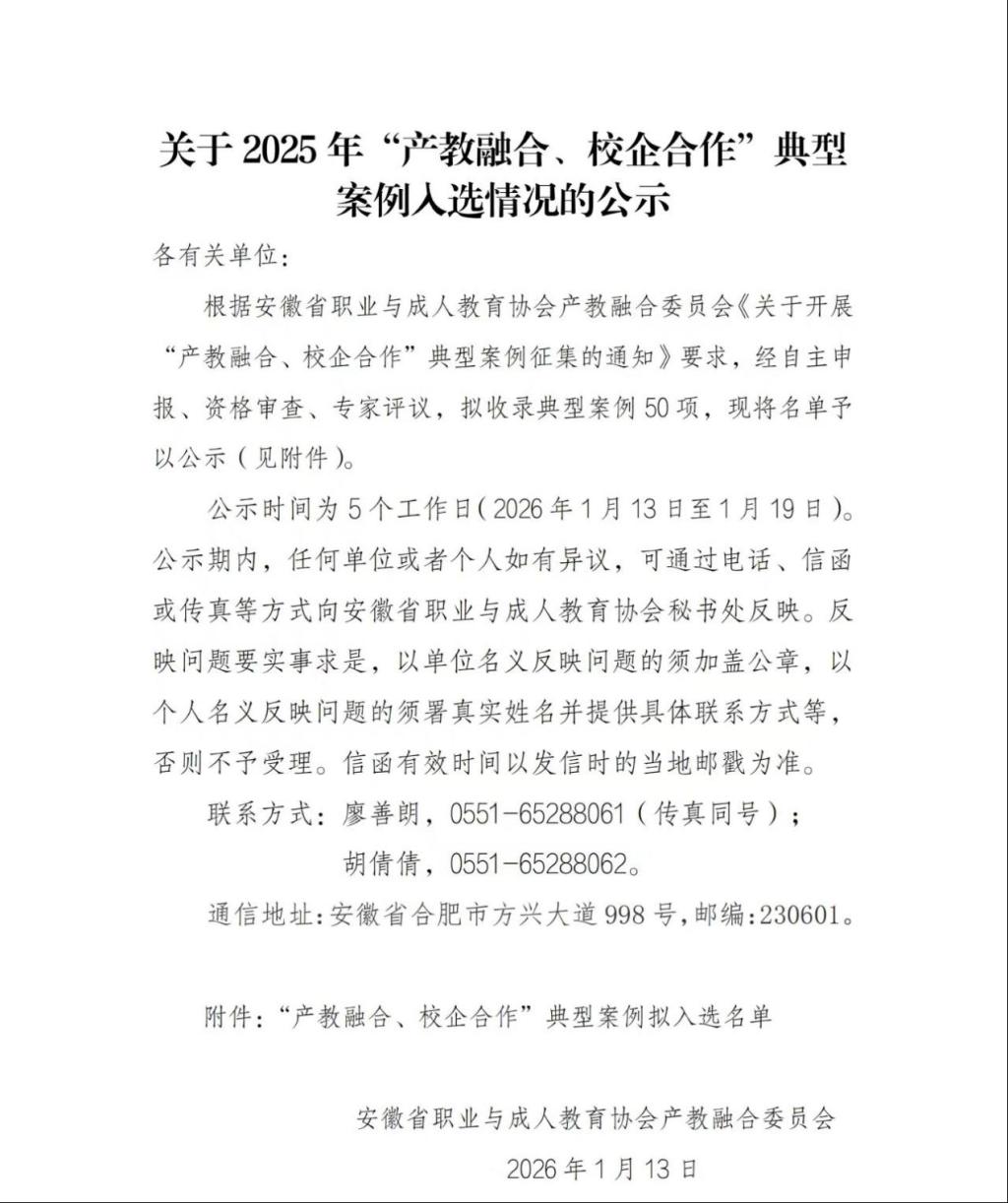 近日,安徽省职业与成人教育协会公示了2025年度“产教融合、校企合作”典型案例拟入选名单。今年会官网今年会联合深圳市讯方技术股份有限公司(以下简称“讯方技术”)申报的《双师驱动 多层融合:打造实战型技能人才培养模式》案例成功进入拟入选名单。
